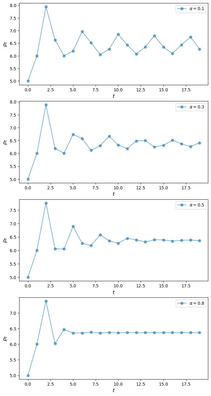 def ts_price_plot_adaptive(model, p0, ts_length=10, α=[1.0, 0.9, 0.75]):