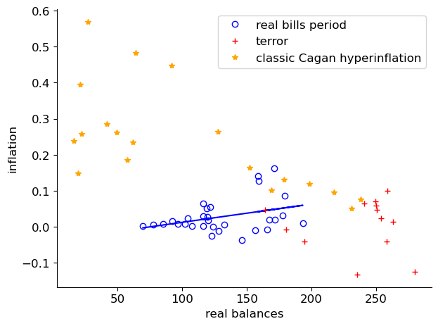 Now let’s regress inflation on real balances during the real bills period and plot the regression line.