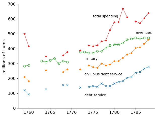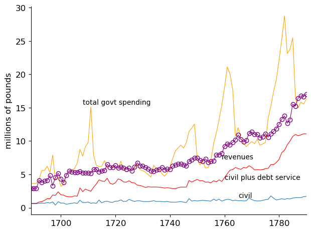 plt.text(1760, 4.2, 'civil plus debt service', fontsize=10)