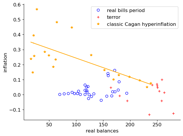 Now let’s regress real balances on inflation during the terror and plot the regression line.