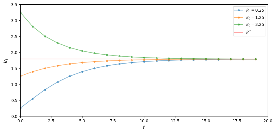 The next figure shows three time paths for capital, from three distinct initial conditions, under the parameterization listed above.