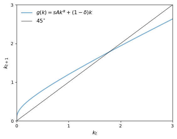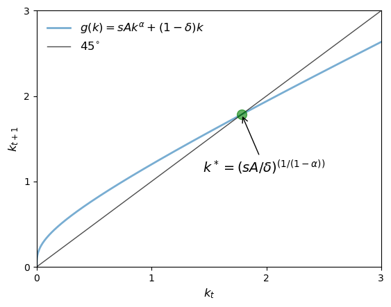 lb = r'$g(k) = sAk^{\alpha} + (1 - \delta)k$'